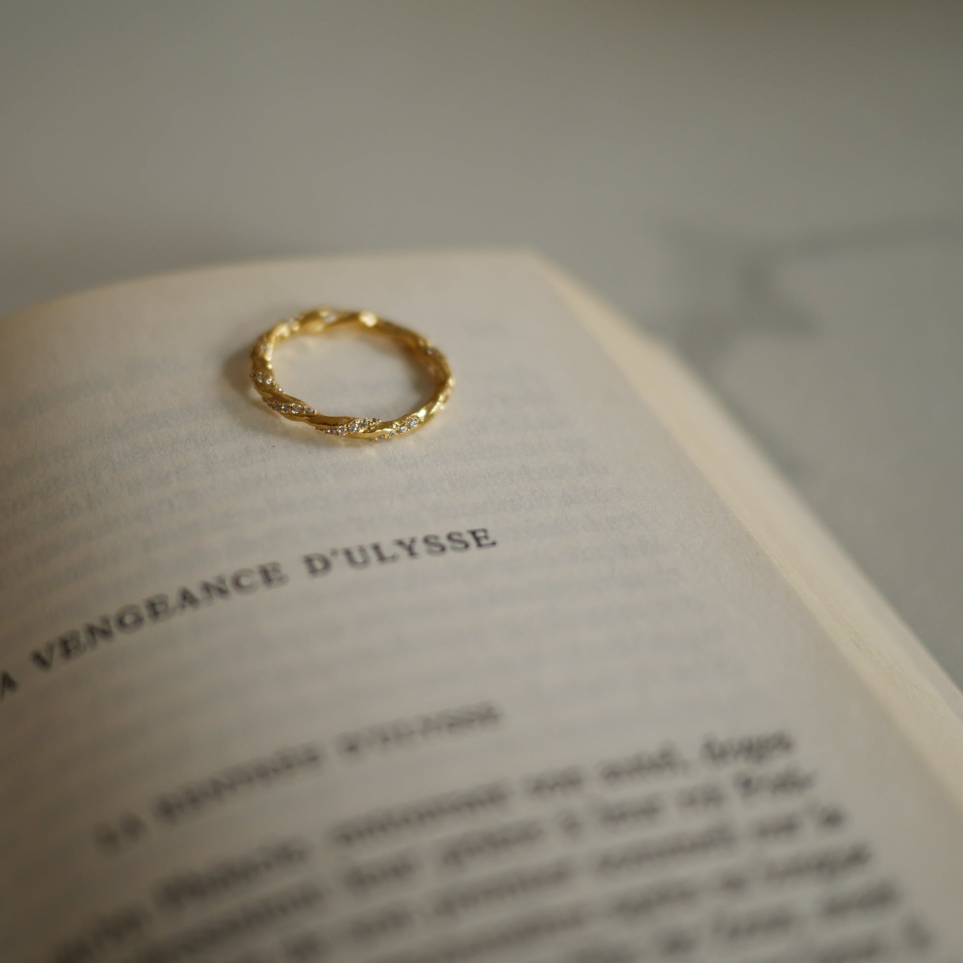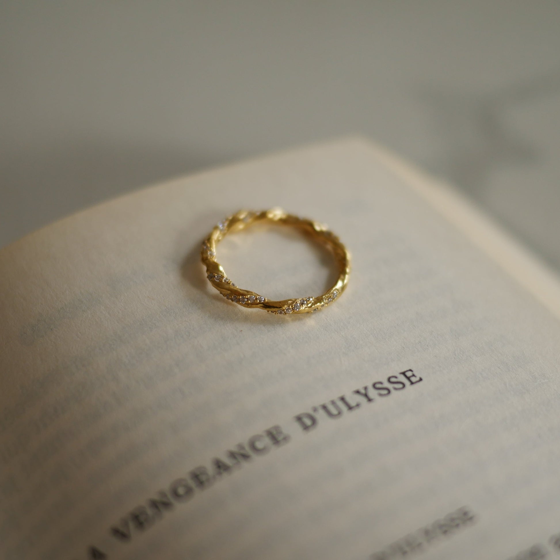 以一條鑲嵌白鋯石的線條與金色戒圈交織纏繞