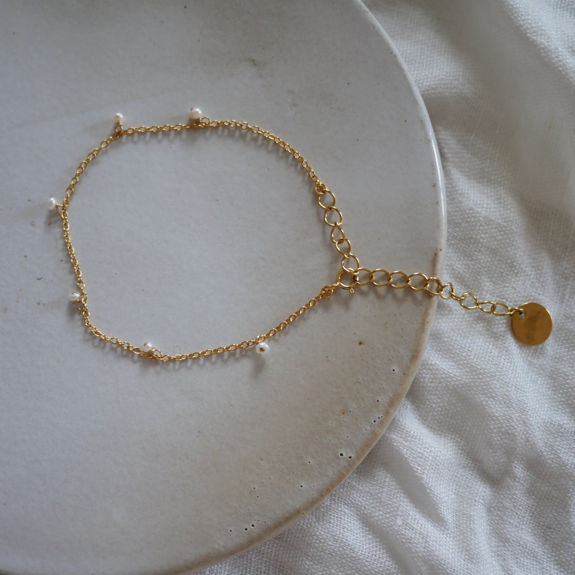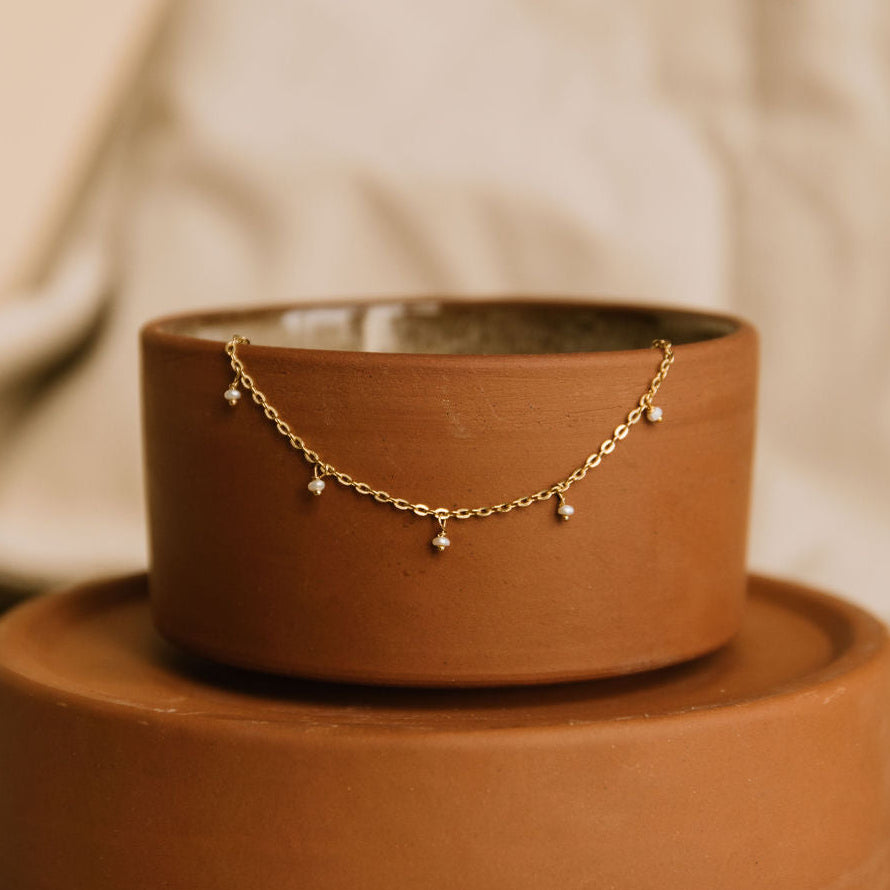 細緻的金屬鏈上點綴著柔潤的 2 毫米養殖珍珠