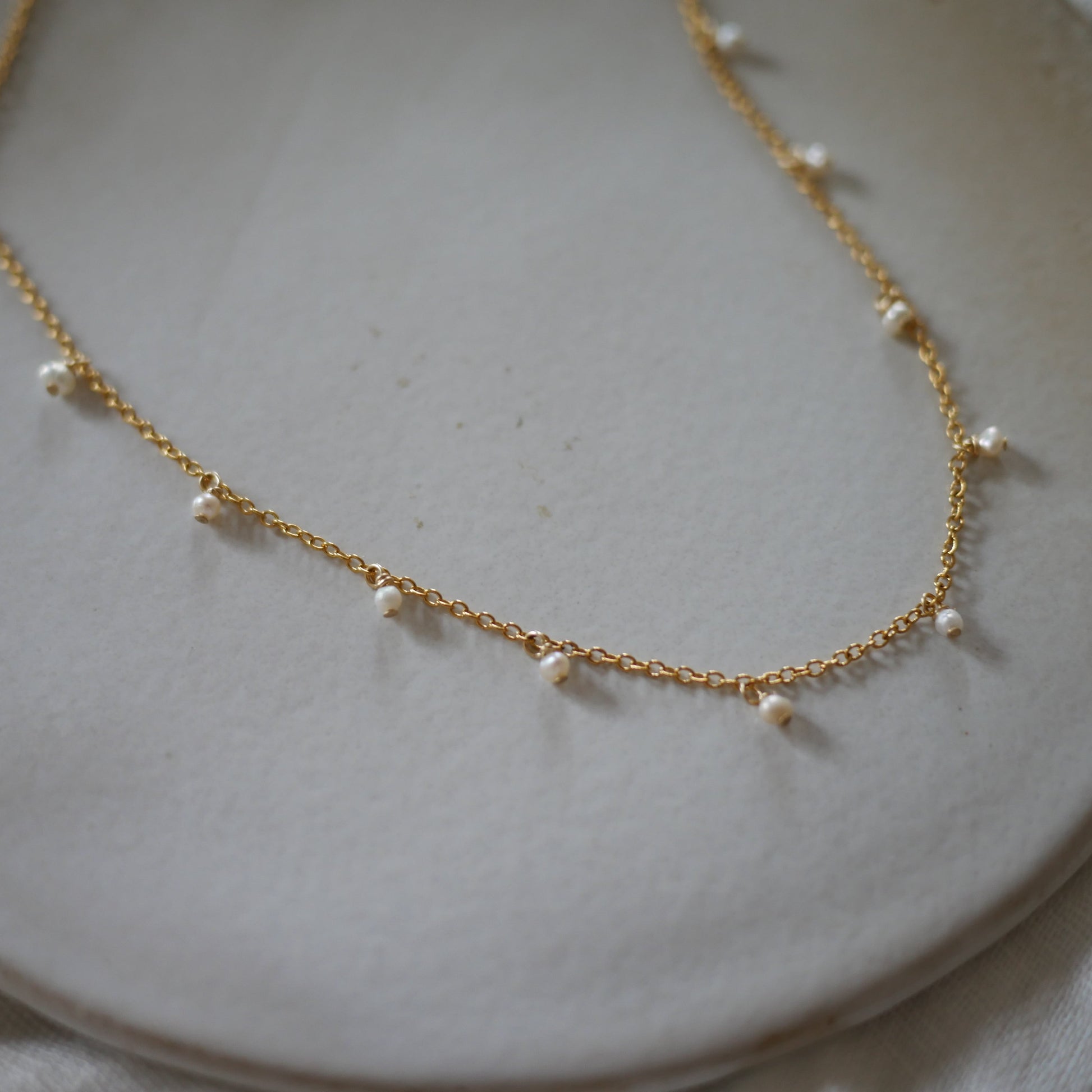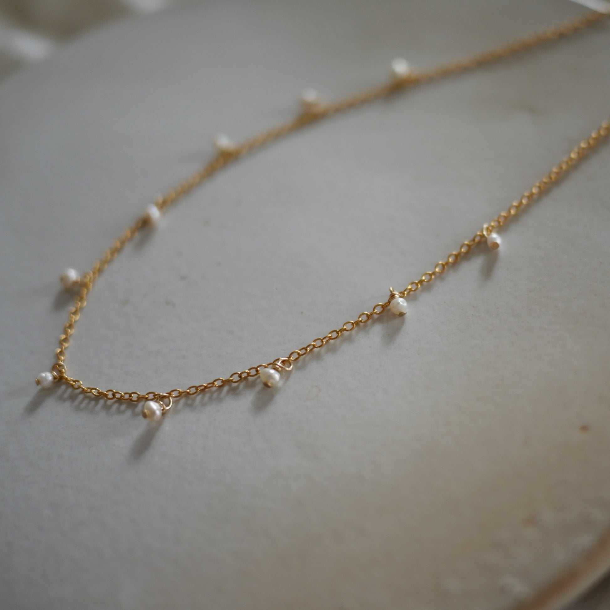 細緻的金屬鏈上點綴著柔潤的 2 毫米養殖珍珠