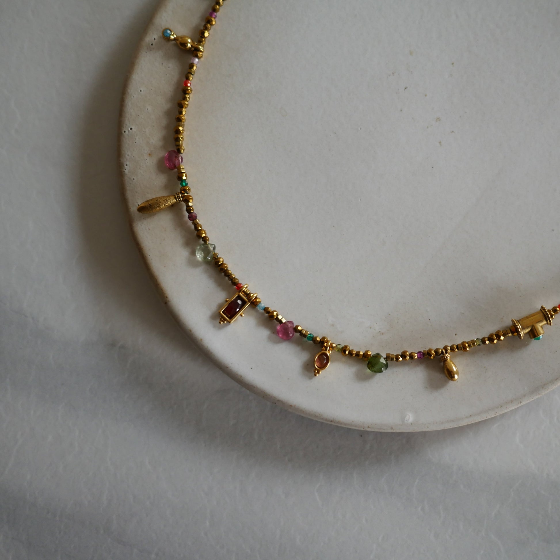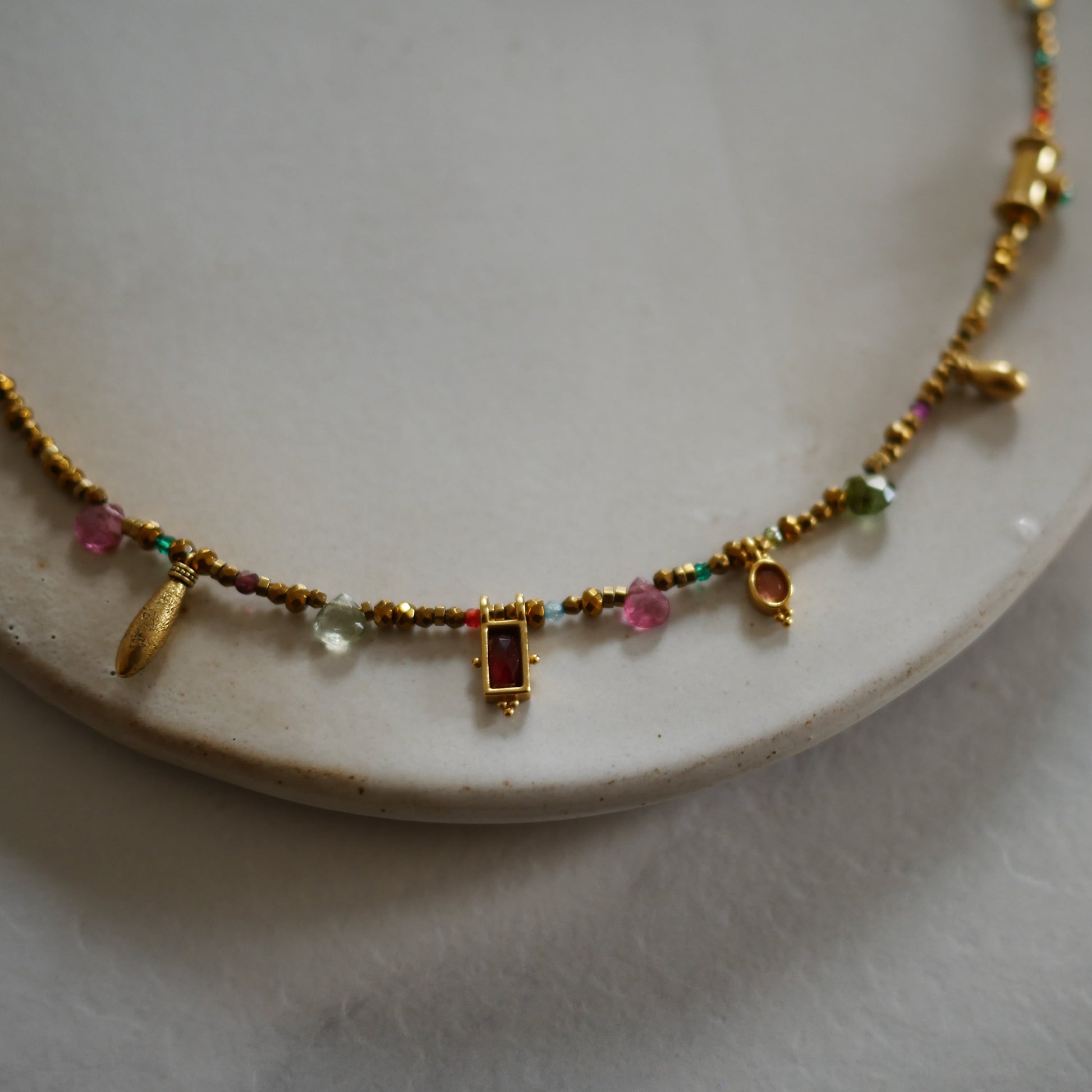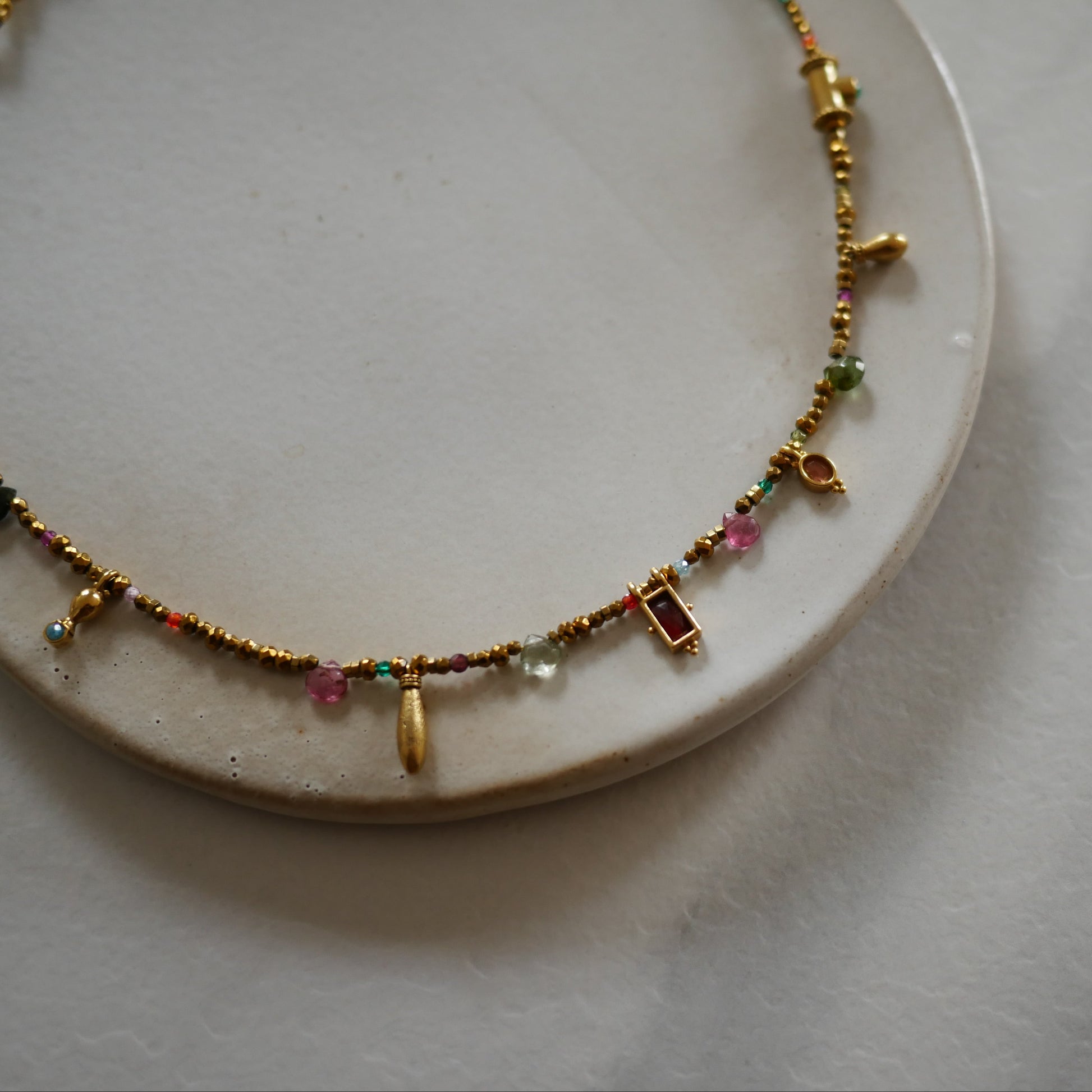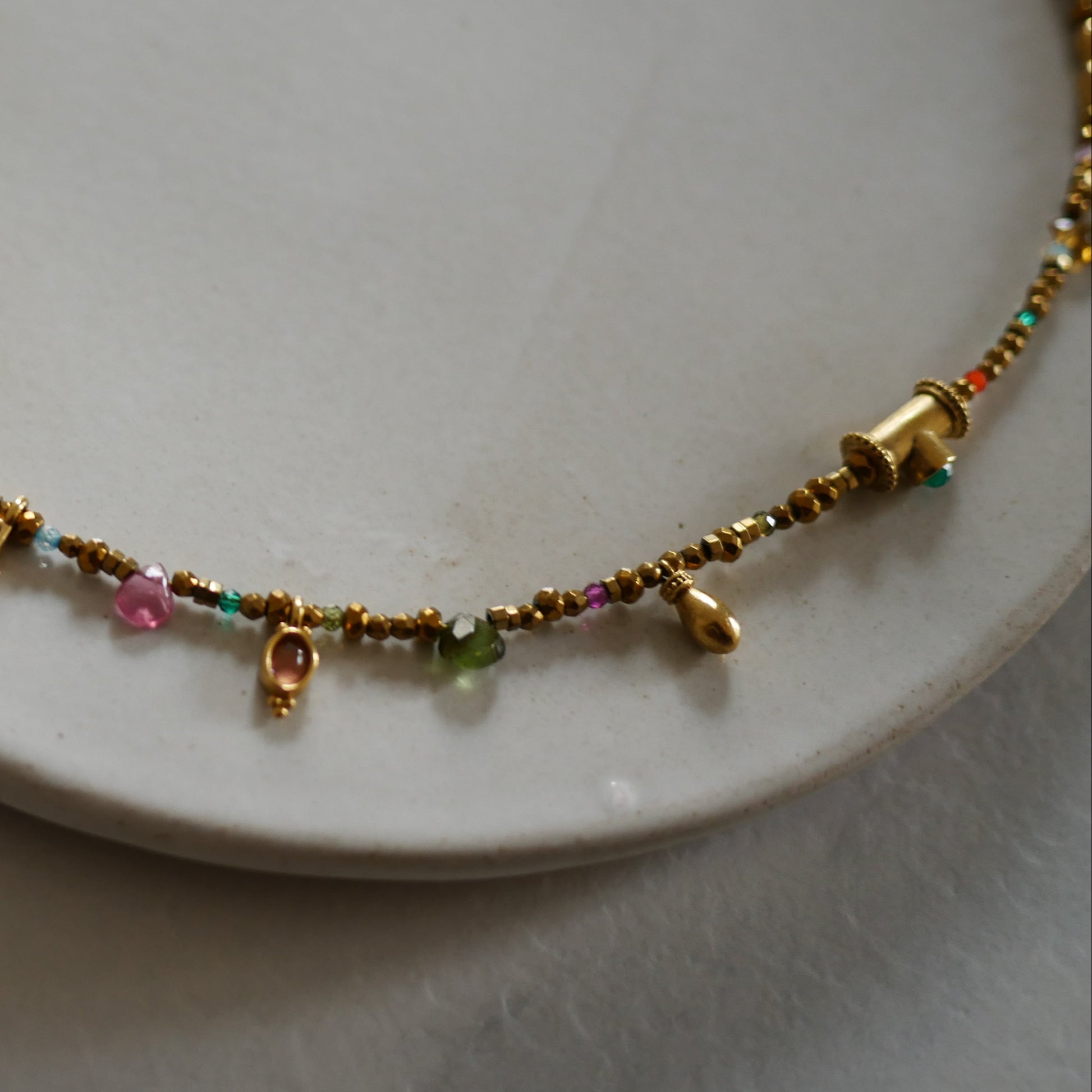 以細緻的黃銅珠串連而成搭配綠瑪瑙、紫水晶、紅玉髓、粉紅碧璽與石榴石等彩色寶石點綴
